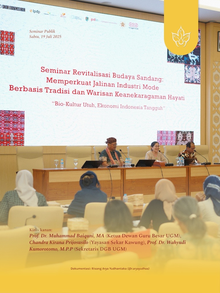 Pada 19 Juli 2025 lalu, kami mendapat kehormatan untuk terlibat dalam penyelenggaraan seminar bertajuk Revitalisasi Budaya Sandang: Memperkuat Jalinan Industri Mode Berbasis Tradisi dan Warisan Keanekaragaman Hayati. Diselenggarakan di Gedung Pusat Universitas Gadjah Mada, seminar ini merupakan buah kolaborasi antara Yayasan Sekar Kawung, Dewan Guru Besar Universitas Gadjah Mada, dan Cipta Garis Temurun. Kami turut bergabung sejak tahap perancangan awal, penyusunan konsep maupun substansi, dan pelaksanaan jalannya diskusi agar seminar ini dapat menjadi ruang pertemuan lintas disiplin yang bermakna.